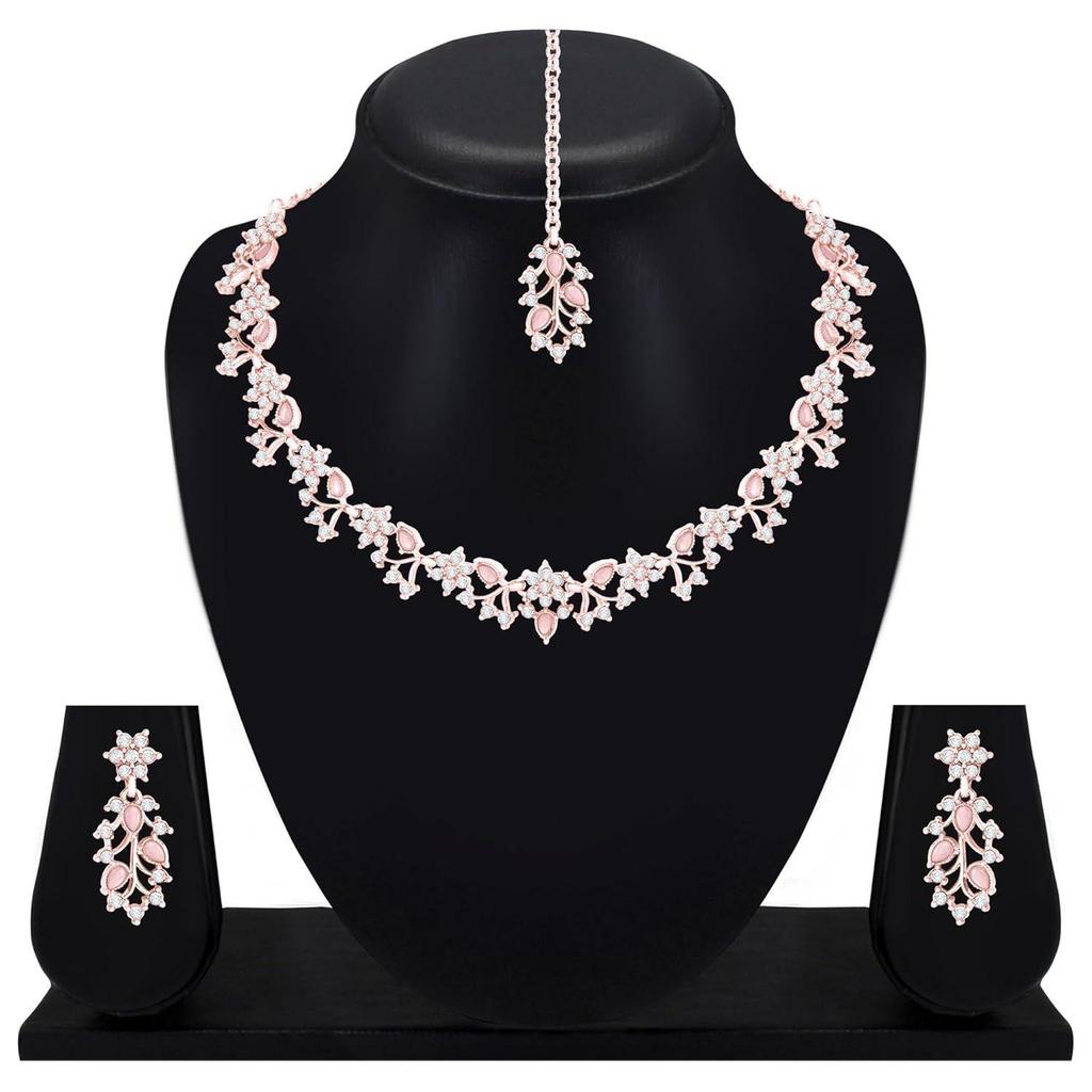 Contains : 1 Necklace + 1 Pair of Earring + 1 Maang Tikka; Color: Rose Gold Plated & Mint Pink