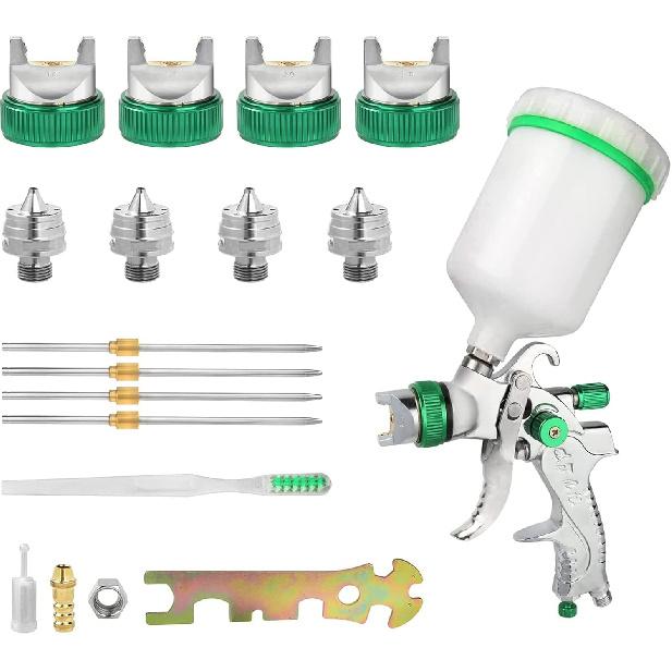 【Package Includes】 1 * paint pray gun, 4 * nozzles (1.4/1.7/2.0/2.5mm), 1 * 600cc cup, 1 * brush, 1 * wrench, 1 * instruction manual. Color carton packaging, also suitable as a gift for friends and family