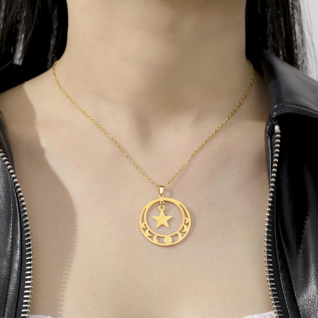 Teamer Star Moon Phase Round Pendant Necklace Women Girls Stainless Steel Party Jewelry No Rust Birthday Gift