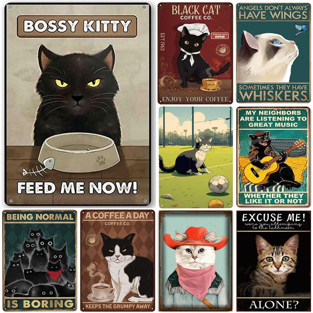 Vintage Cats Metal Tin Signs Bossy Kitty Feed Me Now Wall Posters Decoration for Garden Garage Home Cafe Living Room Club Bar