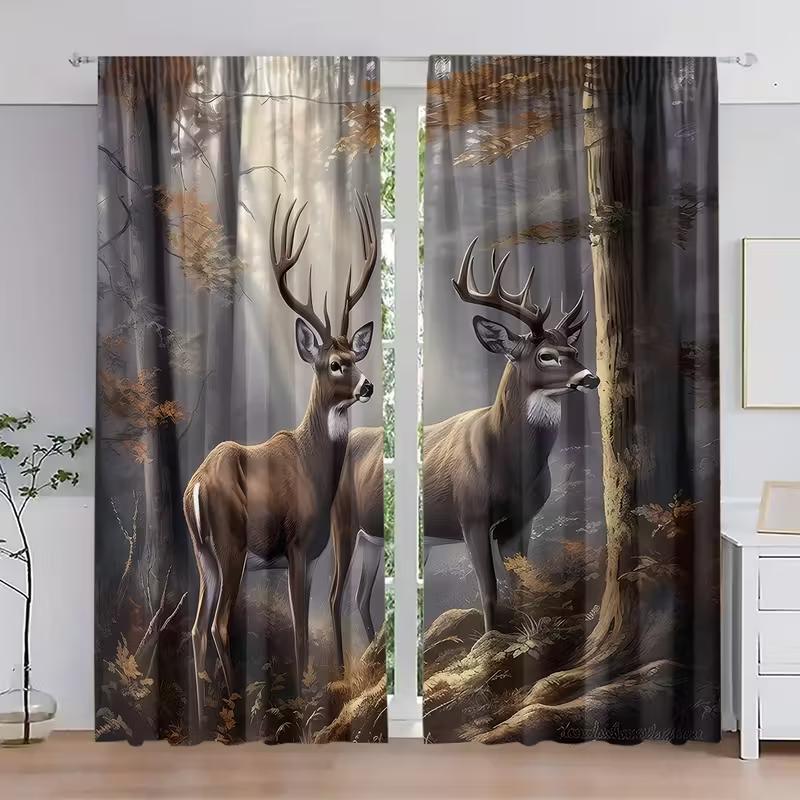 2PCS Forest Deer Printed Curtains, Polyester Material Design with Rod Bags, Bedroom, Home Decoration