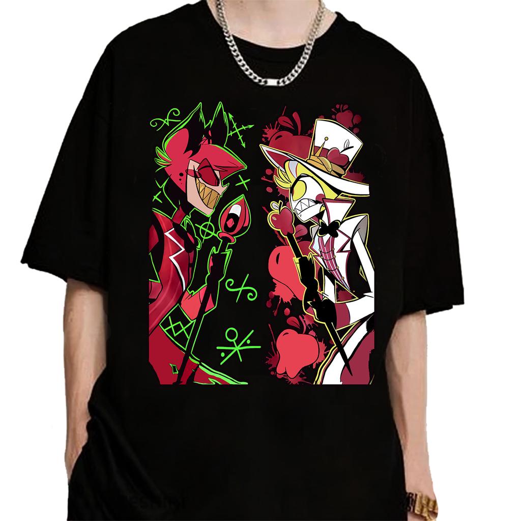 Anime Hazbin Hotel Alastor VS Lucifer Graphic T Shirt Woman Man Harajuku Round Neck T-shirt Gift Tops