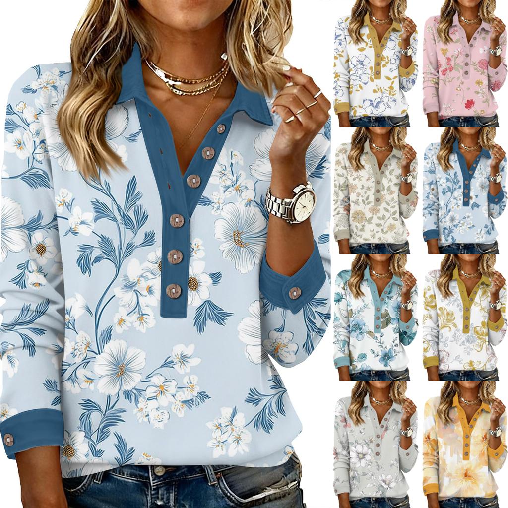 Women's Retro Street Lazy V,neck Long Sleeve Button Floral Print Pullover Top