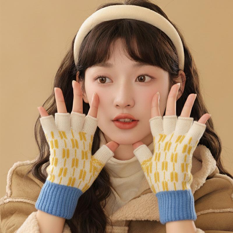 Winter Knitted Gloves, Japanese Style, Color-blocked Half-finger Gloves, Women's Student Warm Gloves, Versatile Fingerless Gloves
