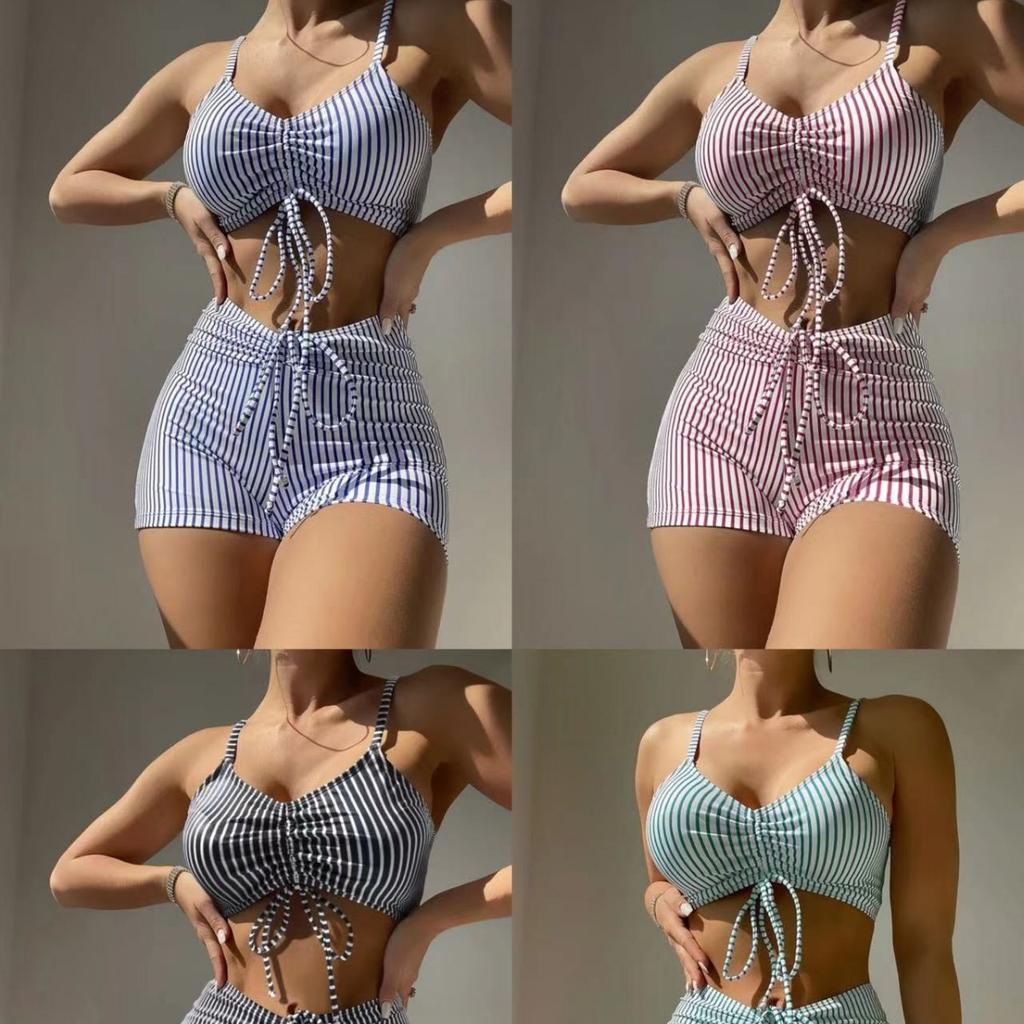 2026 Striped Print Drawstring Lace-up, High-waisted Split Boxers, Conservative Swimsuit, Swimsuit