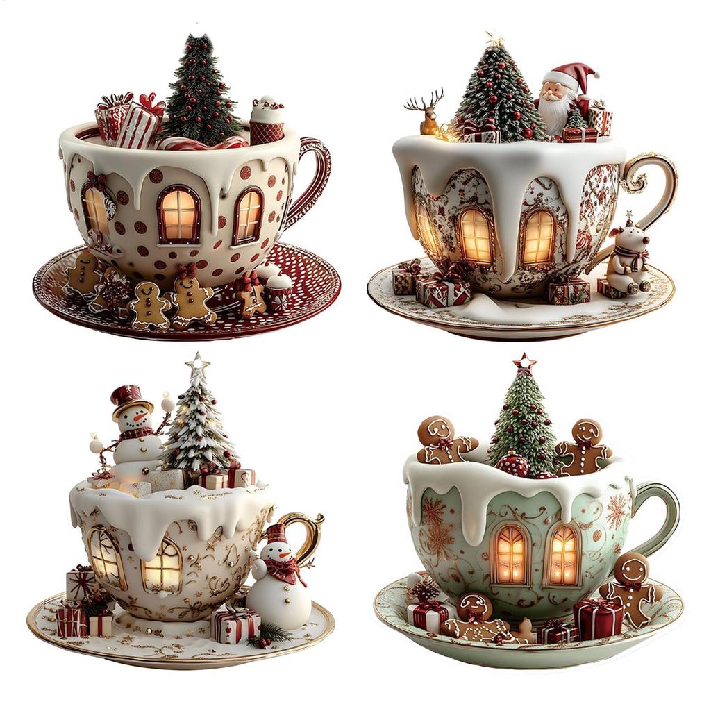 Featuring a snow house and coffee cup shape, these 2D acrylic Christmas ornaments serve as versatile decorations for car interiors, backpacks, tote bags, homes, bedside tables, bookshelves, and workplaces. Designed to appeal to women, men, and youth, they add a festive flair to various environments.