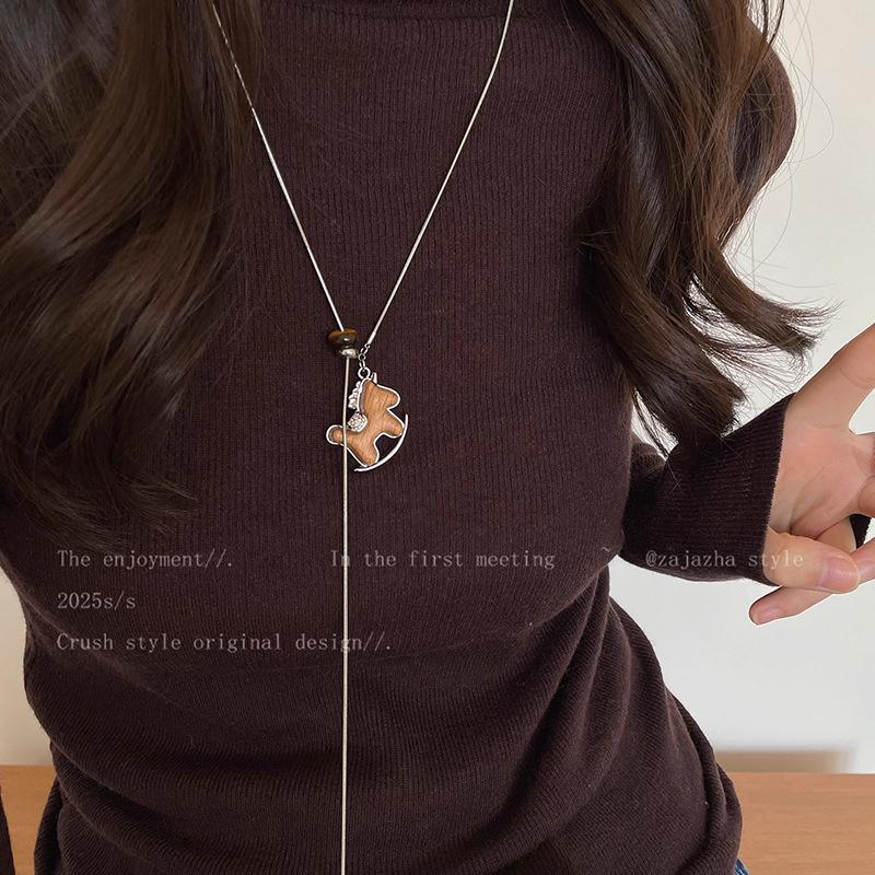 Retro Wooden Pony Pendant Necklace Women's Autumn and Winter Light Luxury High-end Long Sweater Chain Natal Year