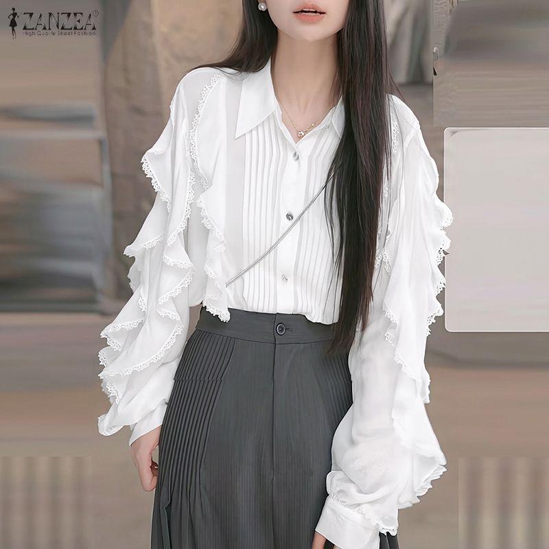 ZANZEA Women Casual Turn Down Collar Loose Ruffles Long Sleeve Blouse
