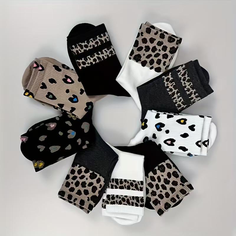 Leopard Print Ribbed Mid-Calf Socks for Women - Autumn/Winter Two-Stripe Casual Design