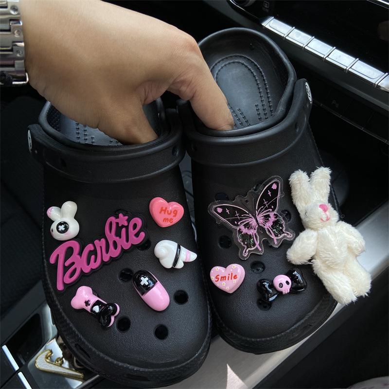 Croc Accessories: DIY Barbie Pink Y2K Emo Shoe Charms with Dark Butterfly Heart Design