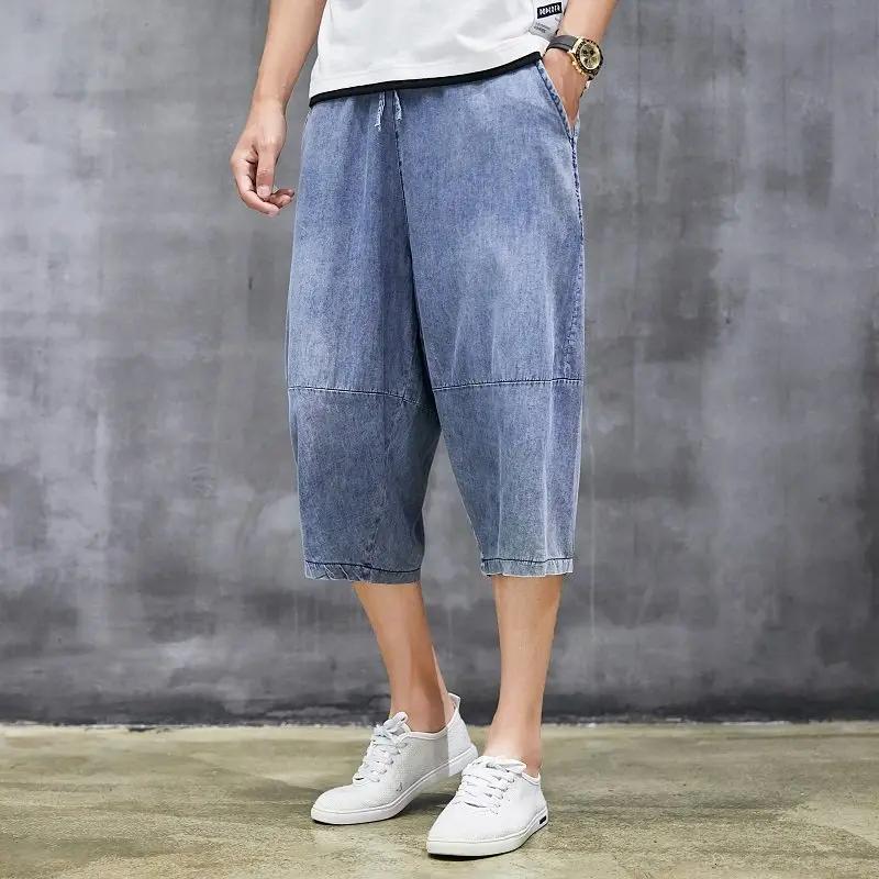 Summer Men Trendy Jean Pants Men Loose Casual Denim Pants Men Wide Leg Pants Male Calf-Lenght Pants Men All-Match Harlan Pants