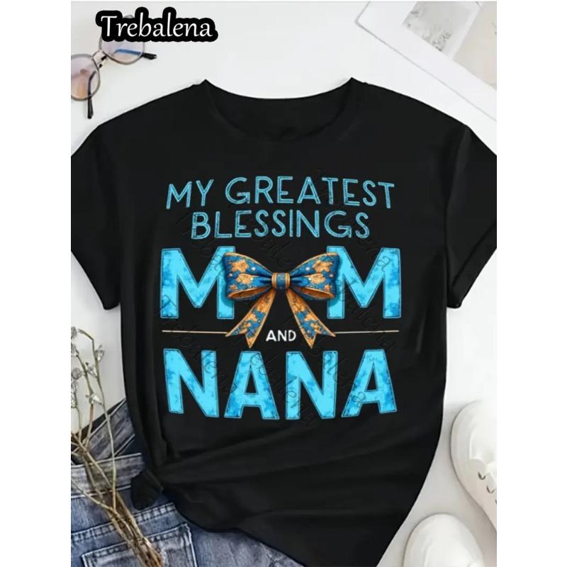 Womens Casual Short Sleeve T Shirt Breathable Cotton Mom Nana Bow Print Black Top Spring Summer Mothers Day Gift Relaxed Fit