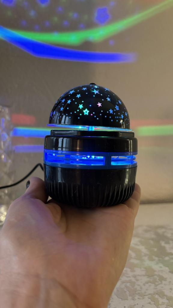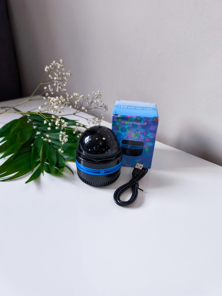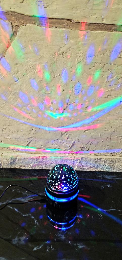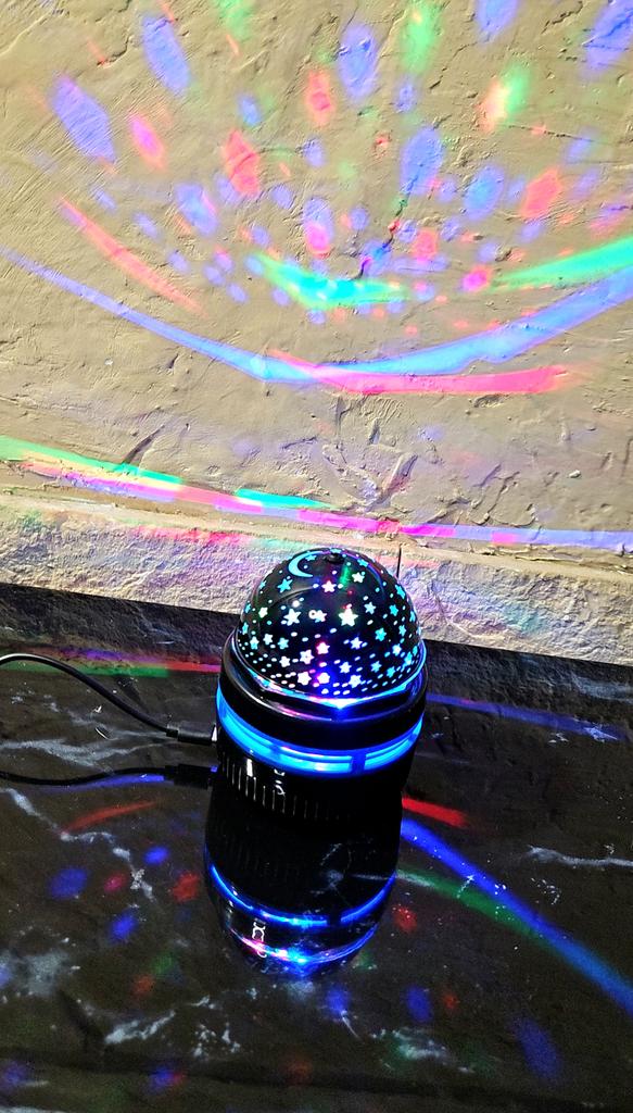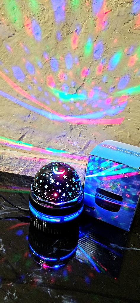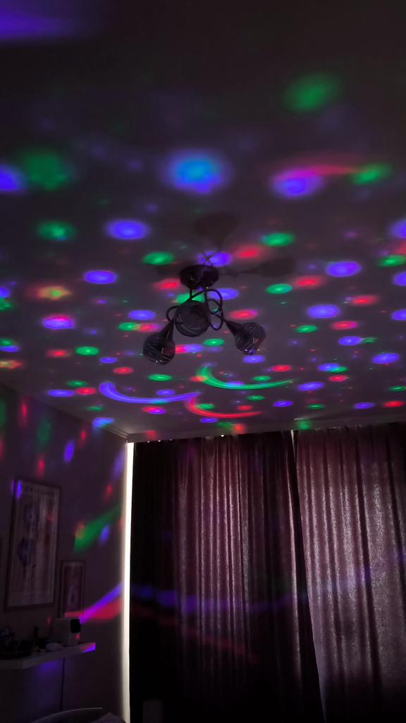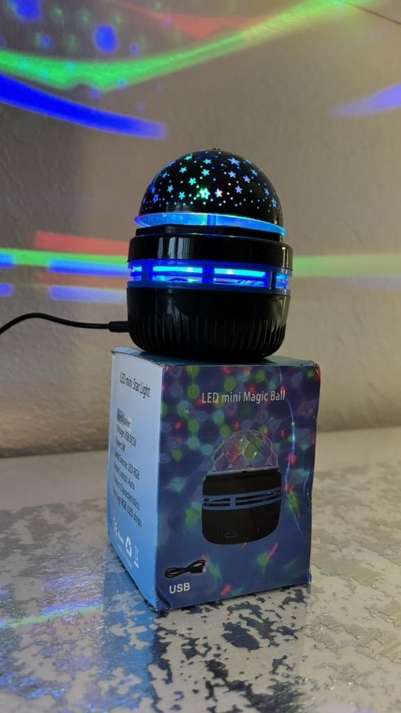 This mini projector is a great way to add atmosphere to a room without extra cost. Here's a brief review of the LED Mini Magic Ball: 🌟 Key Features * 2 in 1: Combines the functions of a 'starry sky' (through perforations in the upper part) and a disco ball with multi-colored highlights. * Power: Works via USB cable, which is convenient — you can connect it to a power bank, laptop, or a regular phone adapter. ✅ Pros * Brightness: The photo shows that the colors (blue, red, green) are quite saturated and apply well to walls and curtains. * Mobility: Thanks to USB power, it can be taken anywhere. * Effect: Creates a cozy or festive atmosphere in seconds. This is a cool budget gadget for home parties, chill zones, or as a night light. For its price, it does the job 100%.