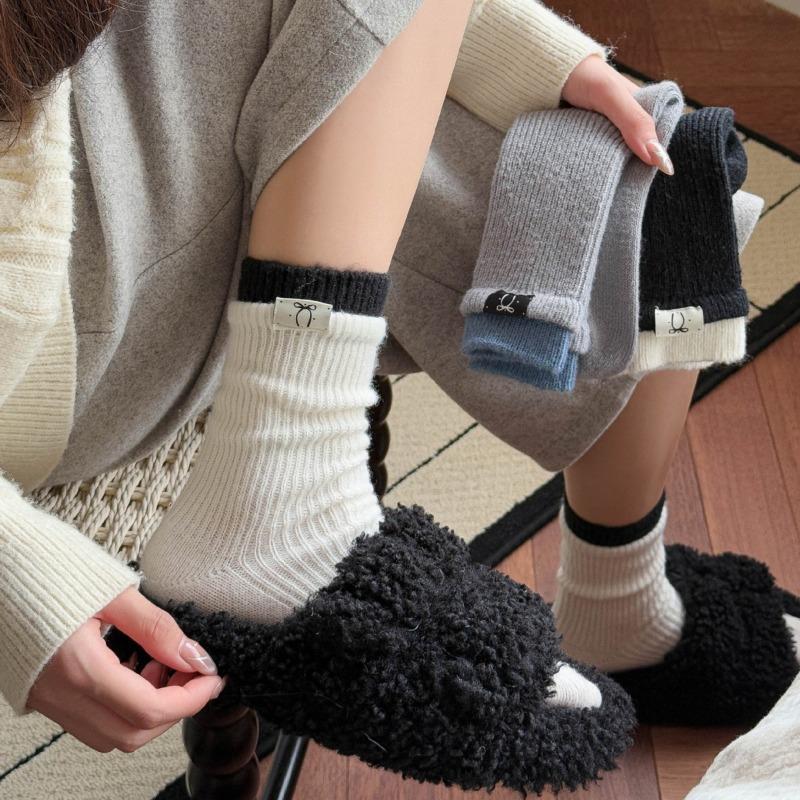 2 Pairs of Wool Socks - Children's Autumn-winter Thick and Warm Color-matched Double-cuffed Fabric Logo Bow Knee-length Socks Trendy Wool Long Socks
