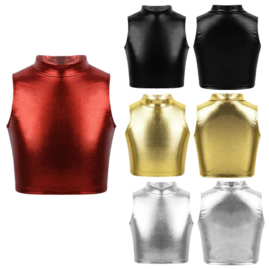 Big Girls Shiny Metallic High Turtleneck Cropped Tank Top Cami Tees for Yoga Dance Gym Sport Bra