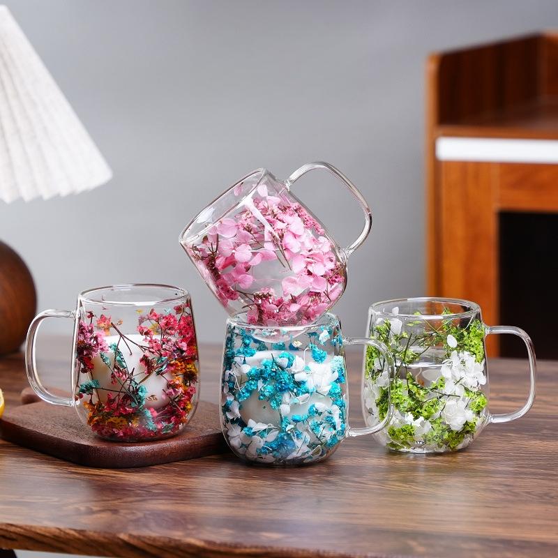 250ml Double-Walled Glass Cup with Handle High Borosilicate Reusable Coffee Mug, Built-In Floral Design for Hot & Cold Beverages