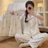 Indulge in comfort and style with this women's summer loungewear set, featuring a playful leopard print and love heart design. This three-piece pajama set is crafted from cloud cotton for the parts touching the skin, offering a soft and gentle feel, while durable polyester ensures longevity. The set includes a short-sleeve top and coordinating pajama bottoms, perfect for staying cool and stylish during warmer nights. Ideal for lounging at home or relaxed sleep, this set combines fun design with luxurious comfort.