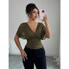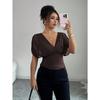 Fashionable and Stylish Lady's Pure Color Deep V-neck Short Puff Sleeves Fitted Waist Blouse
