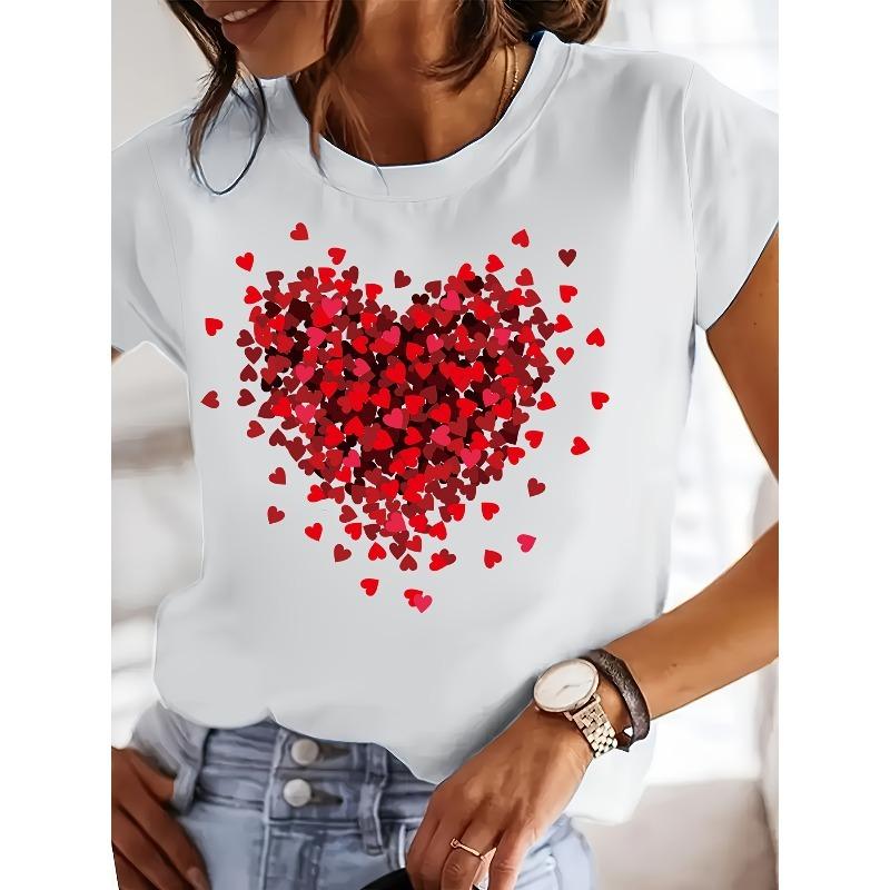 European Size Red Heart Graffiti Valentine'S Day Print | Short Sleeve Round Neck T-shirt for Women, Spring and Summer, Casual Style
