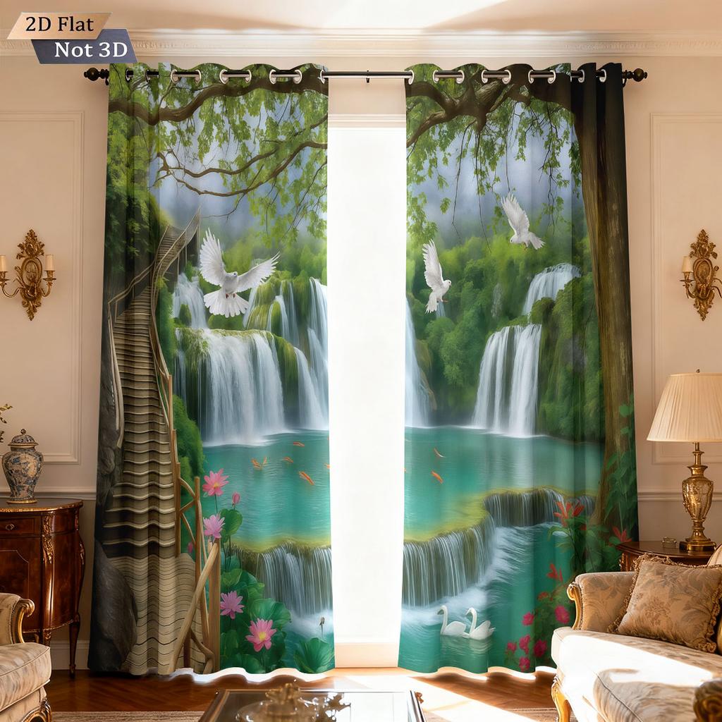 2pcs Natural Scenery Forest Printing Perforated Blackout Curtains Multi Size Living Room Insulation Decoration