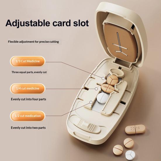 Universal Pill Compatibility: Designed to accommodate round, oval, and irregularly shaped pills, this versatile splitter works seamlessly with a wide range of medications and supplements. The integrated pill storage box allows users to separate and store different pills conveniently, making it perfect for travel or on-the-go medication management.