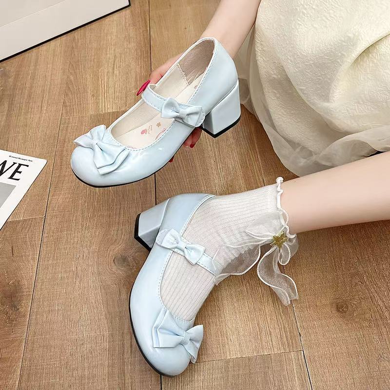 Cute Girl Sweet Round Head Small Leather Shoes Middle Heel Autumn and Summer New Original Lolita Lolita Bow