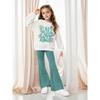 Children's Clothing Girls Floral English Patterns Off-Shoulder Pullover Flared Pants Two-Piece Set Blue-Green Pants Comfortable and Versatile Set