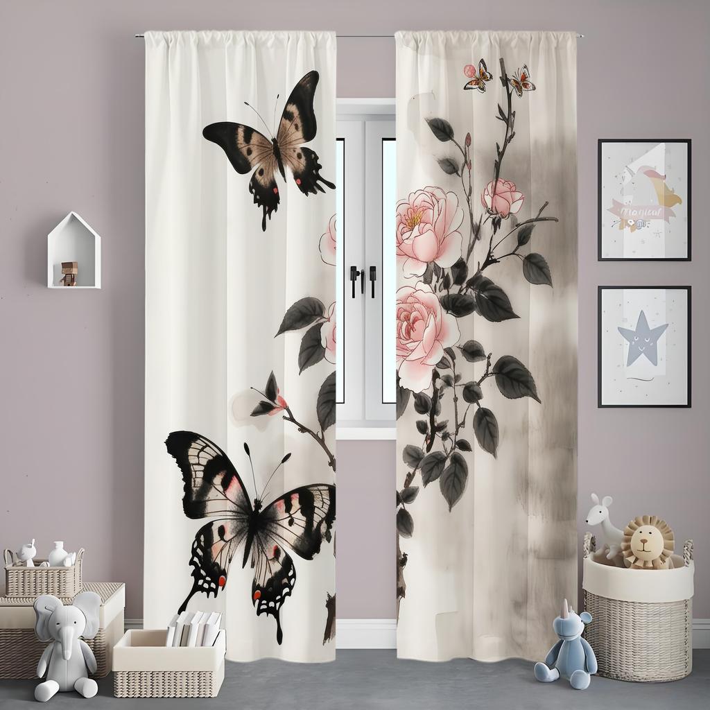 2-Piece Flower Butterfly Design Rod Pocket Curtains Versatile Home Window Decor for Various Scenarios