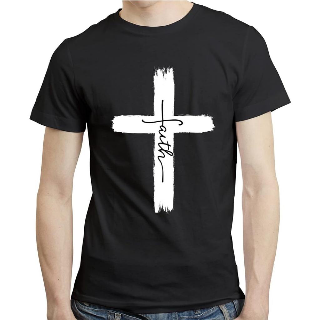 LOXASUM Faith Cross Christian Graphic T Shirt Men Sayings Catholic Religion Novelty Printed Cotton Black Tops