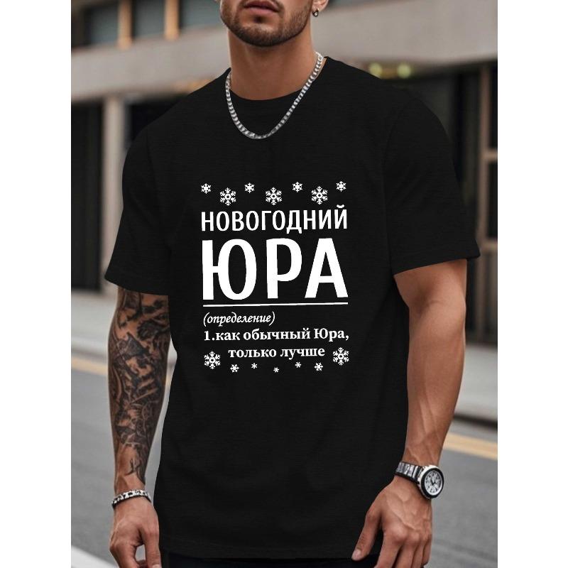 European Sizes Men's Russian-Themed Yura Definition T-Shirt - Cyrillic Script & Geometric Print Short Sleeve Top