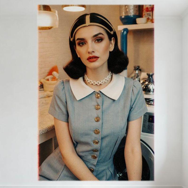 Sexy Vintage Woman In Light Blue Dress Kitchen Scene Metal Tin Sign for Home Wall Decor, Warm Lighting Bar Pub Cafe Decoration