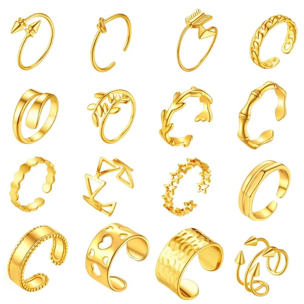 Multiple Styles 14K Gold Color Open Ring Cuffs for Women Arrow Heart Leaf Bamboo Layers Wrapped Resizable Ring Jewelry Gift