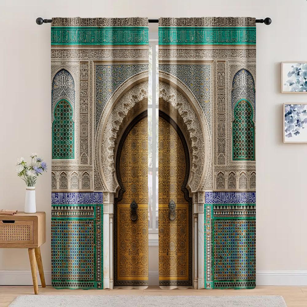 2pcs Spring Summer Curtains Vintage Morocco Palace Door Print Semi-Sheer Curtains Durable 100% Polyester Fabric Decorations