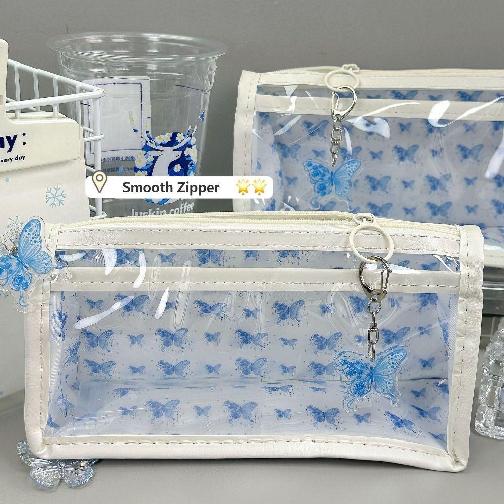 High Quality Butterfly Floral Print Pen Bag Transparent Double Layer Stationery Bag Large Capacity Pencil Case School Office
