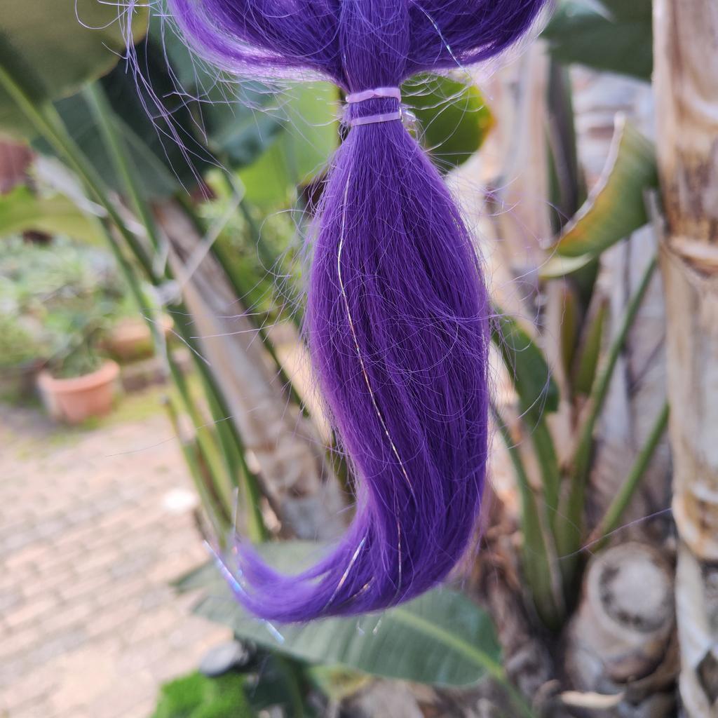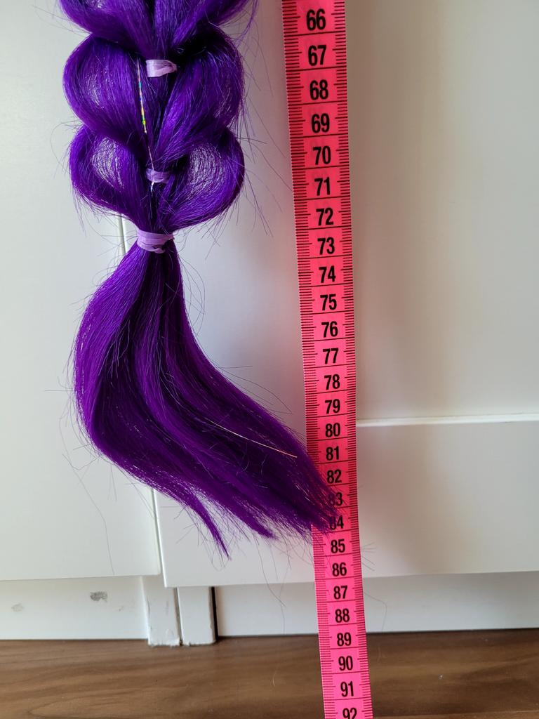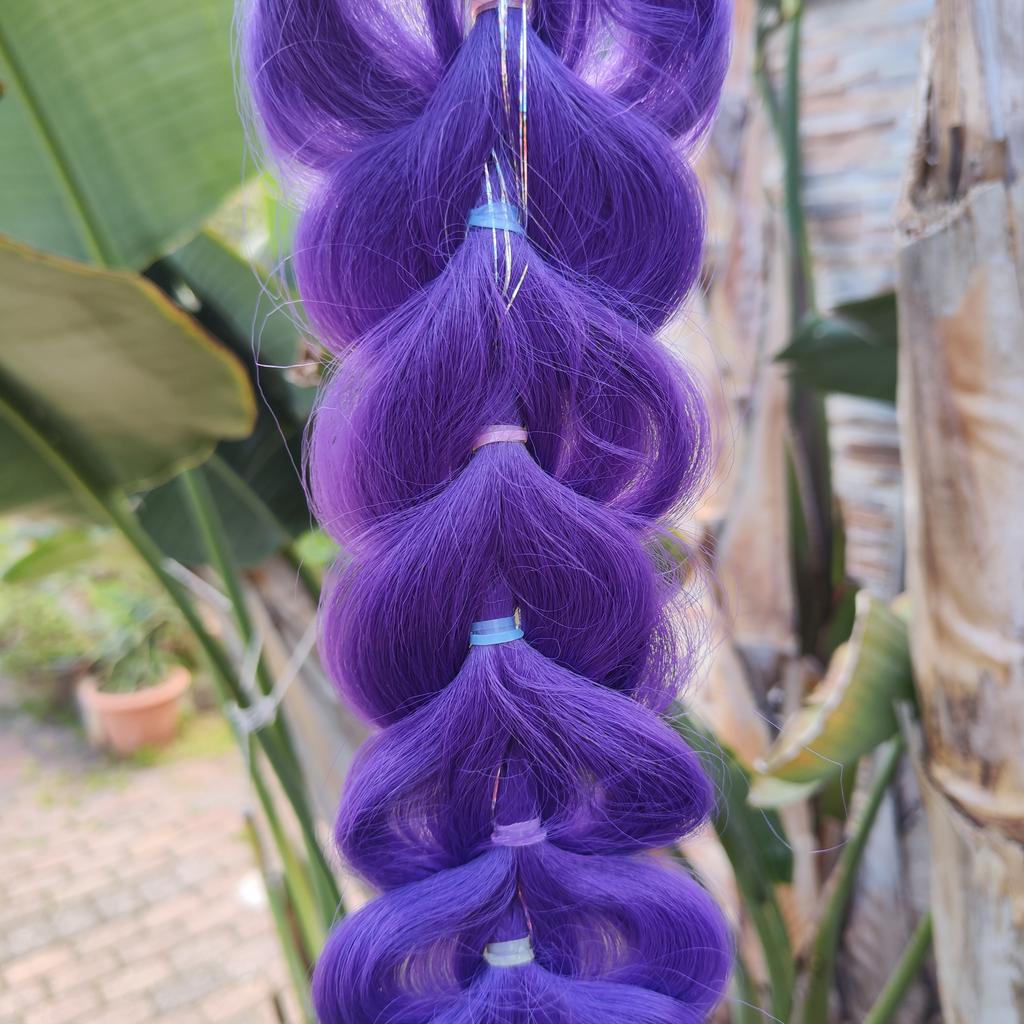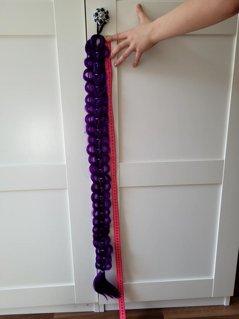 * Ri-Mi Braid for K-Pop: Demon Hunters Cosplay * ⭐⭐⭐⭐⭐ We ordered this braided pigtail for my daughter because she is a huge fan of the movie „K-Pop: Demon Hunters“. She really wanted to look like her favorite heroine Ri-Mi, and the color of the pigtail also matches perfectly.. 💥 Selection & Delivery: There were 3 variants to choose from. We opted for the uniform purple without color gradients. The color is really great and vibrant. The delivery took 16 days, which was absolutely within the expected timeframe.. 💥 Length & Hair Thickness (Point of Criticism): Measured with the tape measure, the braid is a proud 84 cm long. However, there is a noticeable difference in thickness compared to the product images: Unfortunately, the braid is not as thick and lush as it appears in the photos. I had hoped for a significantly "thicker" and more voluminous braid, but in real life it is quite thin and could have had considerably more hair incorporated. The incorporated glitter threads are a nice detail, but they do not make up for the lack of volume.. 💥 Application: Braiding it was tricky. Since I didn't want to open the pre-made form to avoid completely ruining the braid, it was difficult to attach my child's own hair to it. You have to get a bit creative with very thin hair ties and clips here so that the child's own hair doesn't stick out unattractively.. 💥 Conclusion: My daughter is happy anyway and loves to imitate Ri-Mi with it. However, those who expect a really thick, voluminous braid like in the advertising photos might be a little disappointed.
