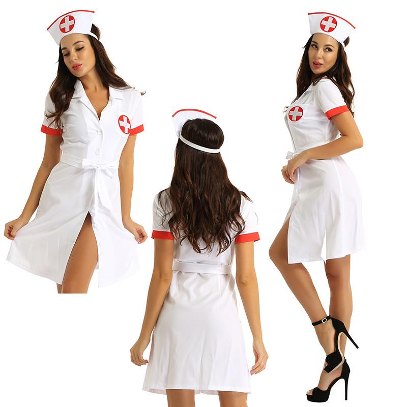 Women Female Sexy Nurse Costume Deep V Sexy Doctor Cosplay Adult Nurse Uniform Role Play Party Dress with Belt and Hat
