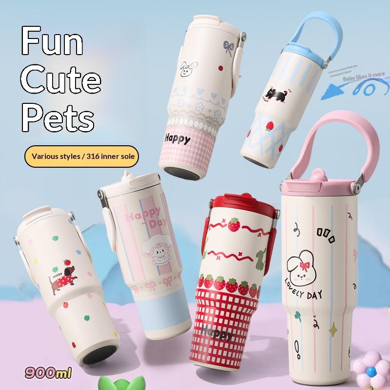 Cartoon Animal Thermos Cup Large Capacity Stylish Portable Straw Cup Outdoor Women's Insulated Coffee Mug