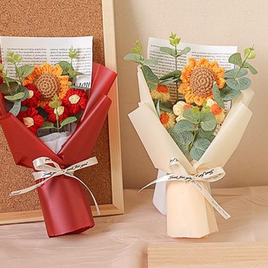 This handcrafted crochet bouquet is a timeless, maintenance-free gift that never fades, perfect for special occasions like Mother's Day, Valentine's Day, weddings, anniversaries, and birthdays. Featuring one crochet sunflower, four crochet daisies, and four artificial eucalyptus stems, each flower is meticulously hand-knitted from soft milk cotton yarn by skilled artisans to replicate the natural beauty of real blooms.