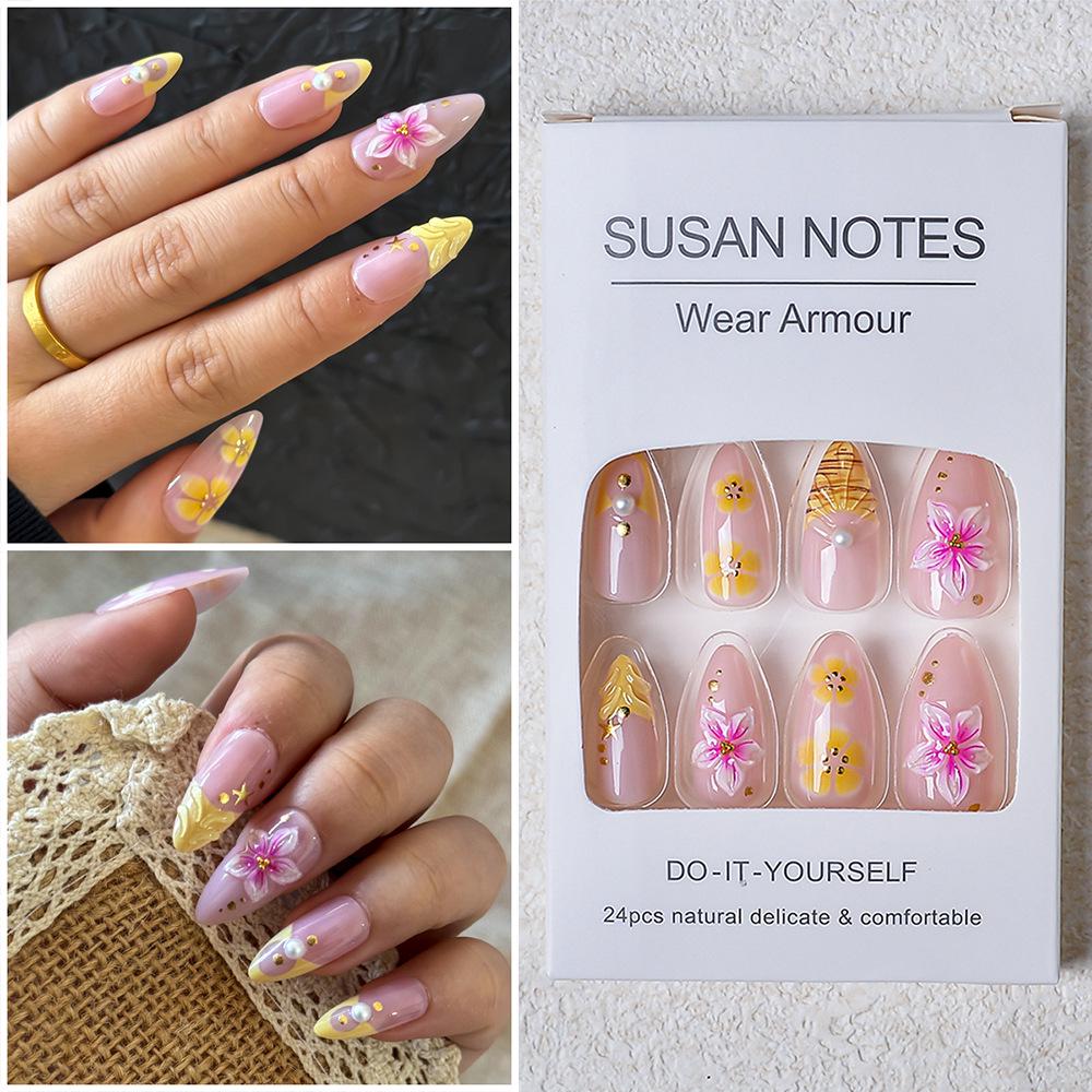 24-Piece Five-Petal Flower 3D Pearl Almond-Shaped Wearable Nails
