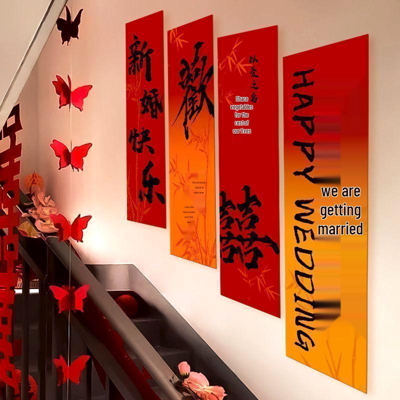 Wedding Room Decor Set: Staircase Background, Double Happiness Characters, Handrail Flowers, Bride & Groom Gift for New Home.