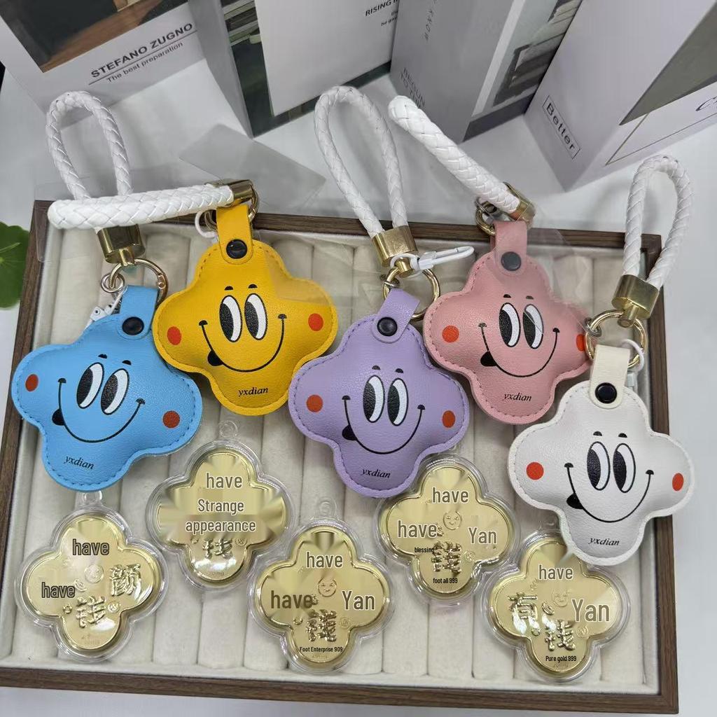 This charming accessory combines elegance and whimsy, featuring a smiley face and four-leaf clover design crafted from 999 pure gold. The intricate floral motif adds a touch of nature-inspired beauty, making it a standout piece. Perfectly sized for versatility, it can be used as a keychain or a bag charm, adding a luxurious and cheerful accent to your everyday essentials. The sturdy construction ensures durability, while the polished finish enhances its sophisticated appeal, making it a delightful gift or personal treasure.
