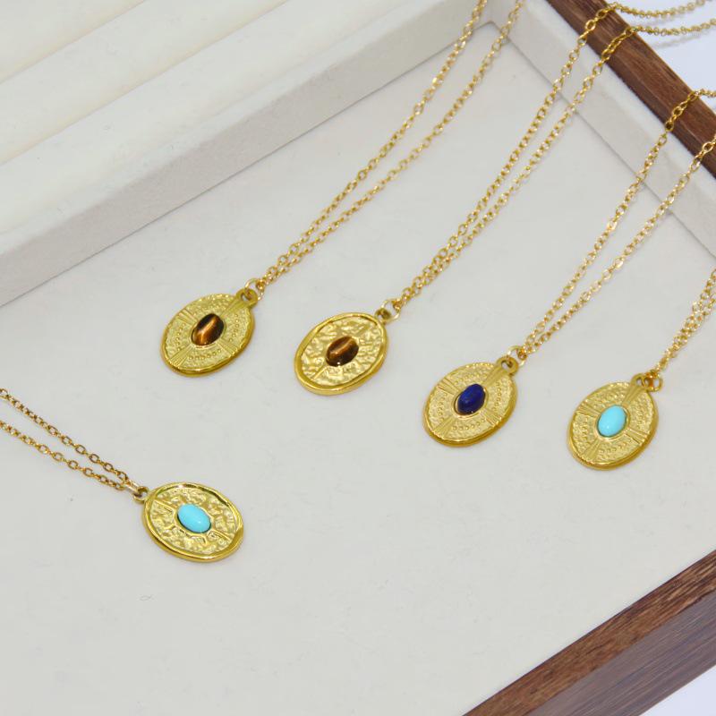 Retro Turquoise Inlaid Stainless Steel Necklace with Embossed Round Pendant for Women