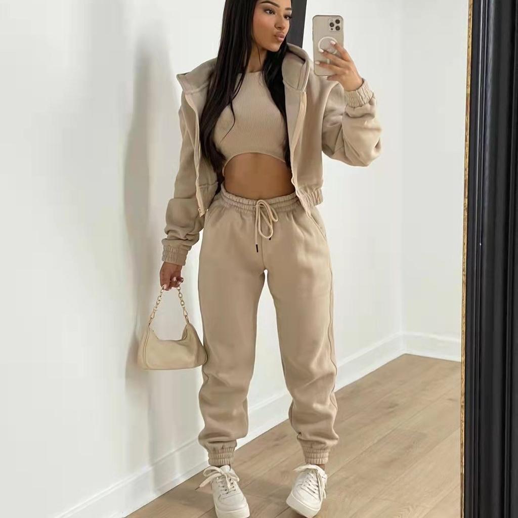 Fashion Women Casual Long Sleeve Zip Hoodies Ribbed Tank High Waist Sweatpants Jogger Pant Suits Sporty Three Pieces Outfit