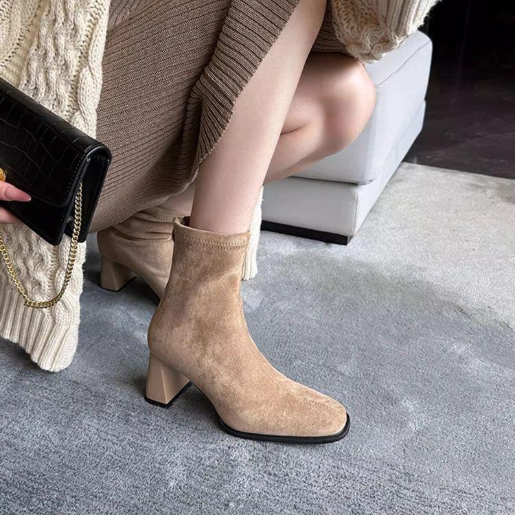 Gentle Short Boots Heighten Wind Thick Heel Thin Lady Martin Boots Rear Zipper Square Head Suede