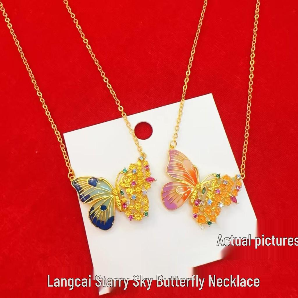 Blue-Fired Filigree Butterfly Pendant Necklace with Gold Enamel, Light Luxury Courtly Style.