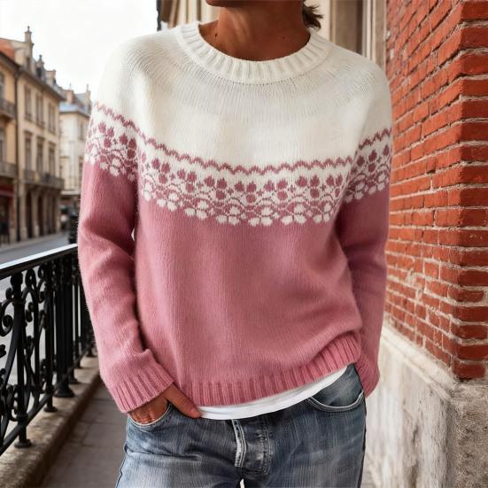 Women's sweater is crafted from soft and breathable polyester, ensuring all-day comfort and warmth. The loose hem provides a flattering fit, complementing various body shapes. Featuring a stylish patchwork design, round neck, and long sleeves, this sweater is a versatile addition to your wardrobe.