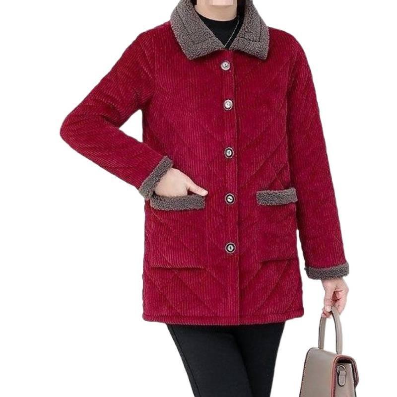 Elderly Womens Autumn and Winter Plus Size Cotton-padded Coat Plus Velvet Jacket Mothers Relaxed Fit Cotton-padded Jacket One Tone Lapel