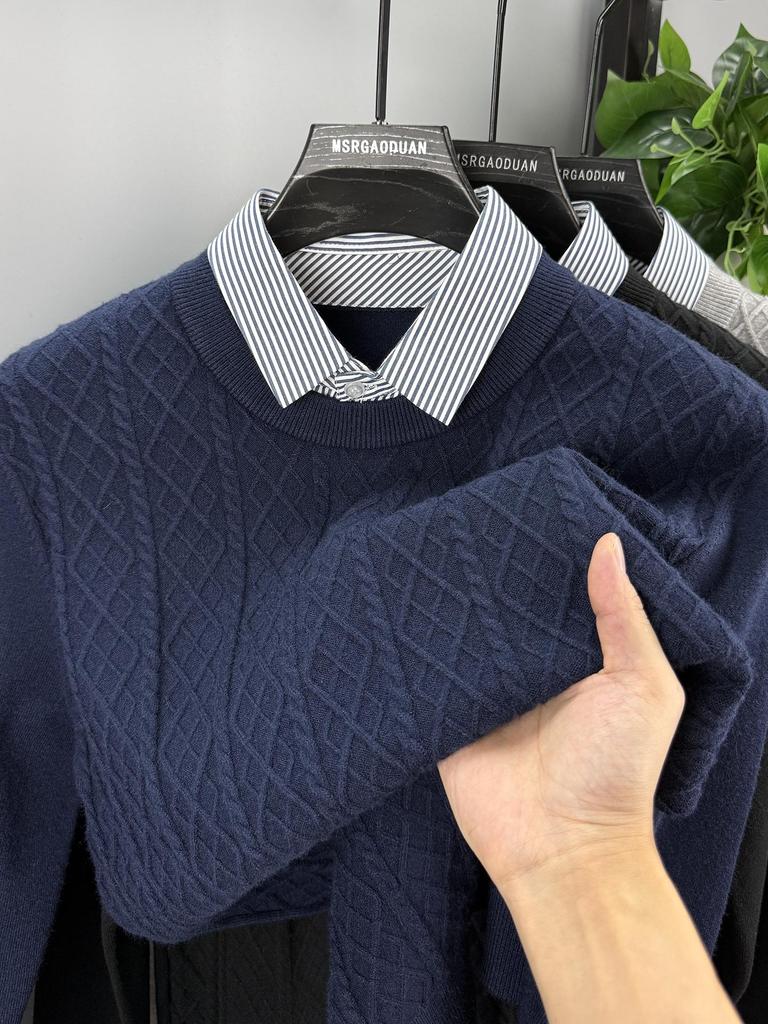 Introducing a stylish and versatile addition to your autumn and winter wardrobe: a trendy fake two-piece sweater designed for fashion-forward men. This warm knit pullover features a sophisticated shirt collar, effortlessly combining a stand neckline with long sleeves for a refined look. Crafted with standard thickness, it ensures comfort and coziness during cooler months. The sweater is made from a soft viscose material, with a chemical fiber blended faux fur for added warmth and texture. Ideal for layering or wearing on its own, this sweater is perfect for both casual outings and more polished occasions.