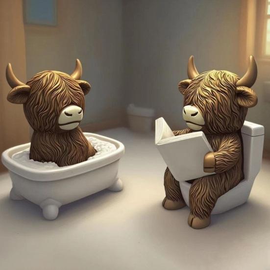Charming and Unique Design: Featuring a whimsical Highland Cow figurine sitting on a toilet, either bathing or reading, this statue brings playful charm and artistic flair. Its creative design serves as a conversation starter while enhancing the aesthetic appeal of your home or office d?or.