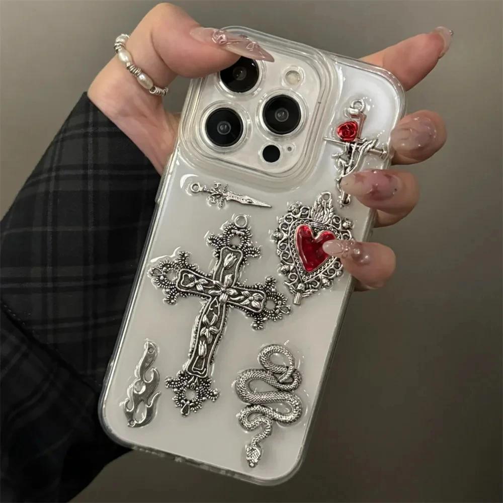 Luxury Bling Gothic Cross Love Heart Flame Snake Clear Phone Case For iPhone 17 16 15 13 12 11 Pro Max 14 Plus Epoxy Soft Cover